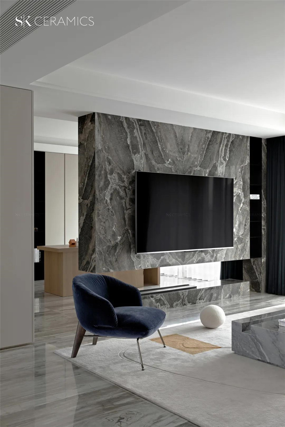 SK木玉灰,經典時尚灰為空間主調,設計師巧思以寶石藍色軟裝作為點綴。一抹純粹的藍,淡雅而夢幻,寧靜而幽遠,帶給空間無盡的浪漫想象。