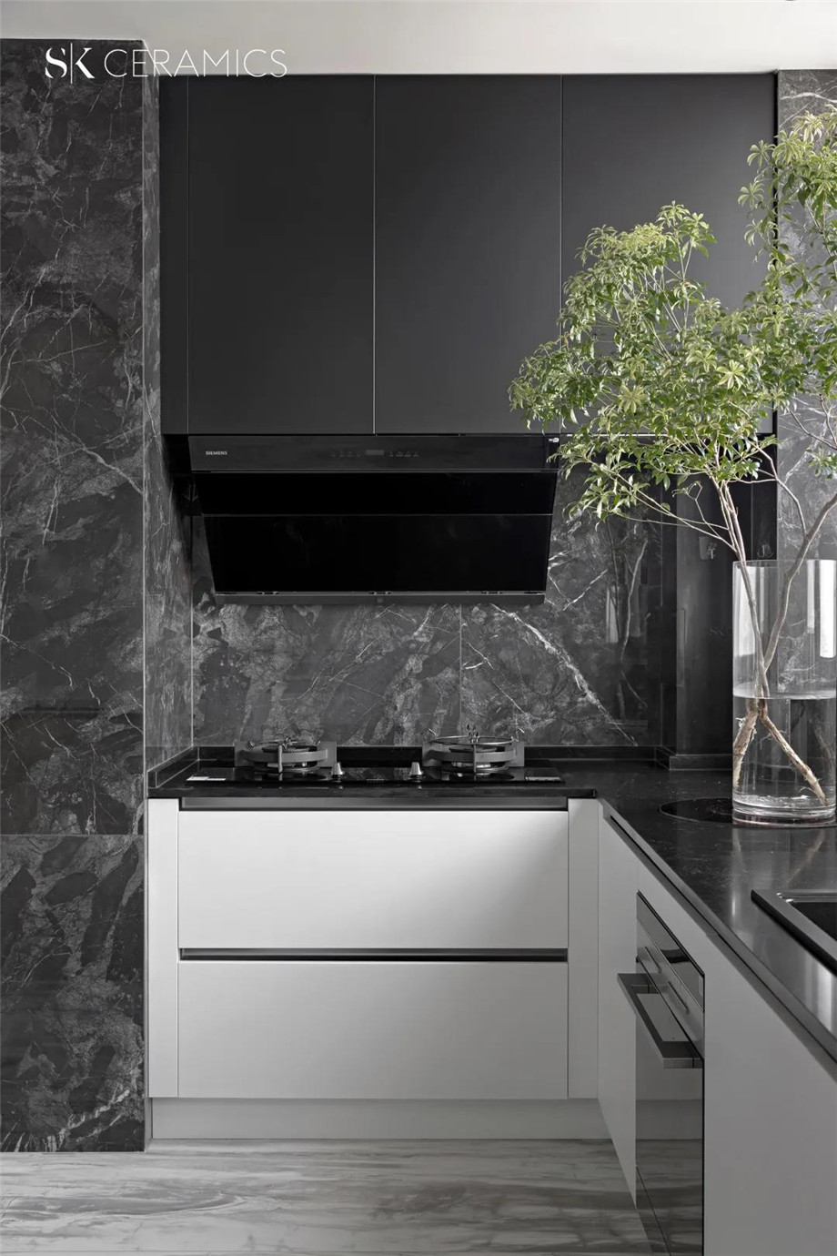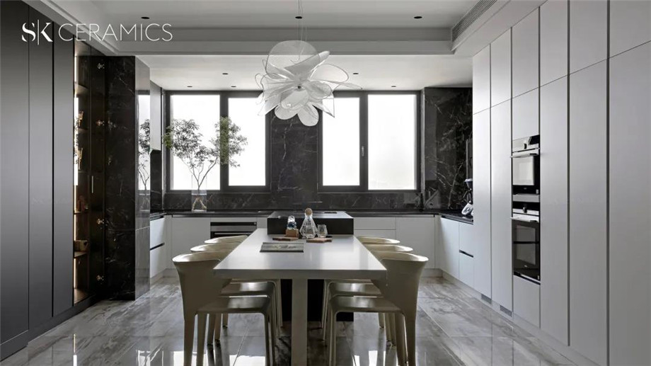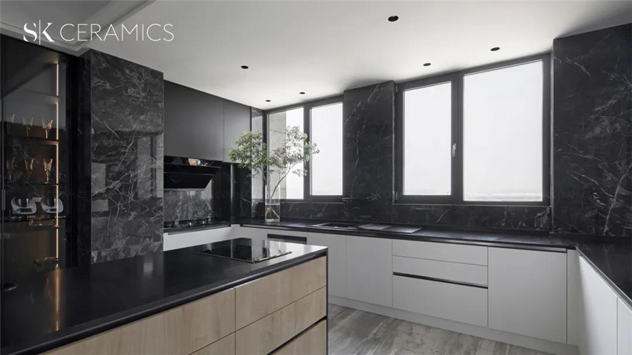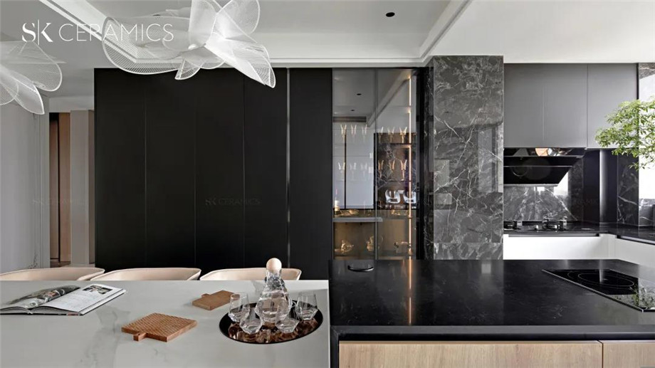 SK 800x1800意大利黑,色彩斑駁 深淺交錯,富有層次感的大理石紋理,給空間一種充滿想象力的神秘感,搭配白色調的櫥柜設計,一張一弛,賦予空間靈動的氣息。
