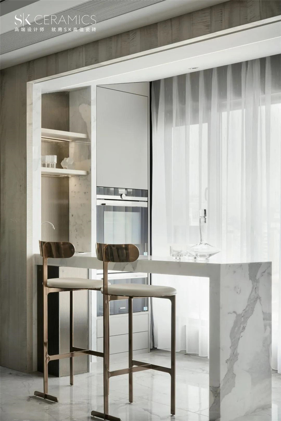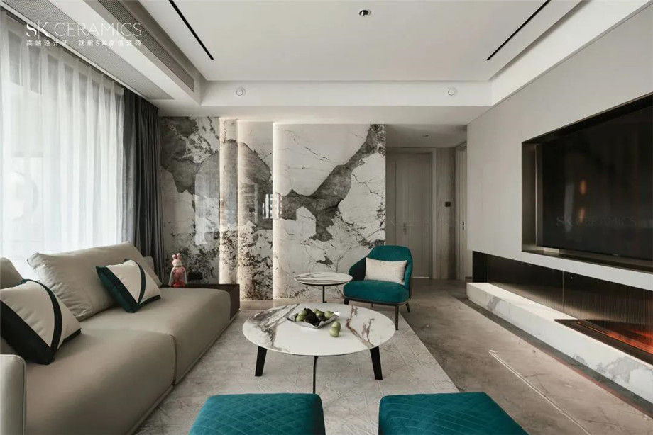 素雅的空間,以SK巖板-銀狐作為設計點綴,行云流水般的藝術紋理,自由靈動,勾勒出生活本真及初始之美,呈現一個自然、雅致、放松的居家空間。