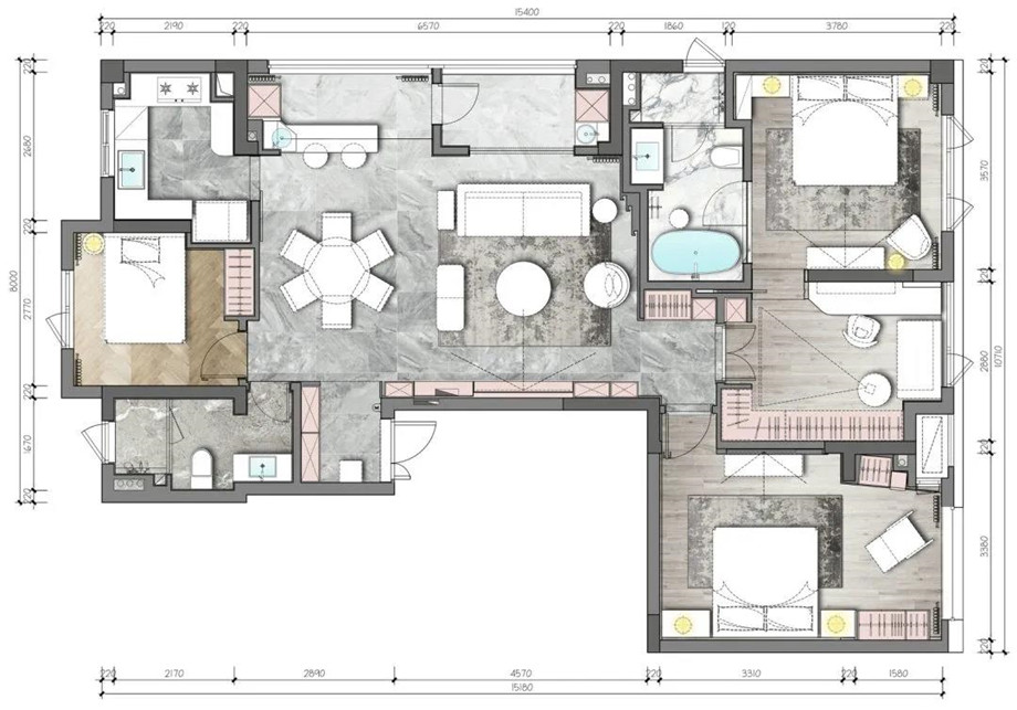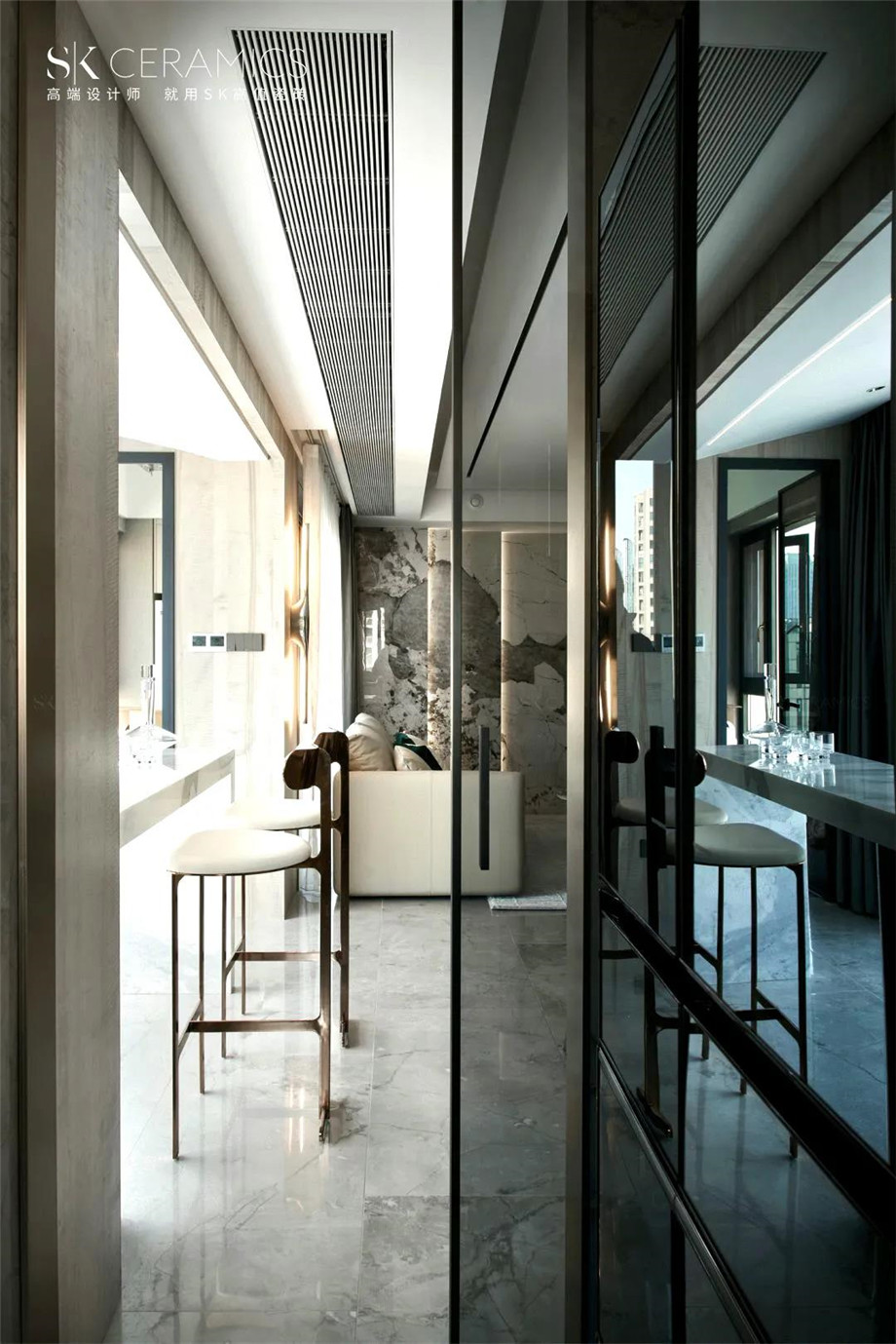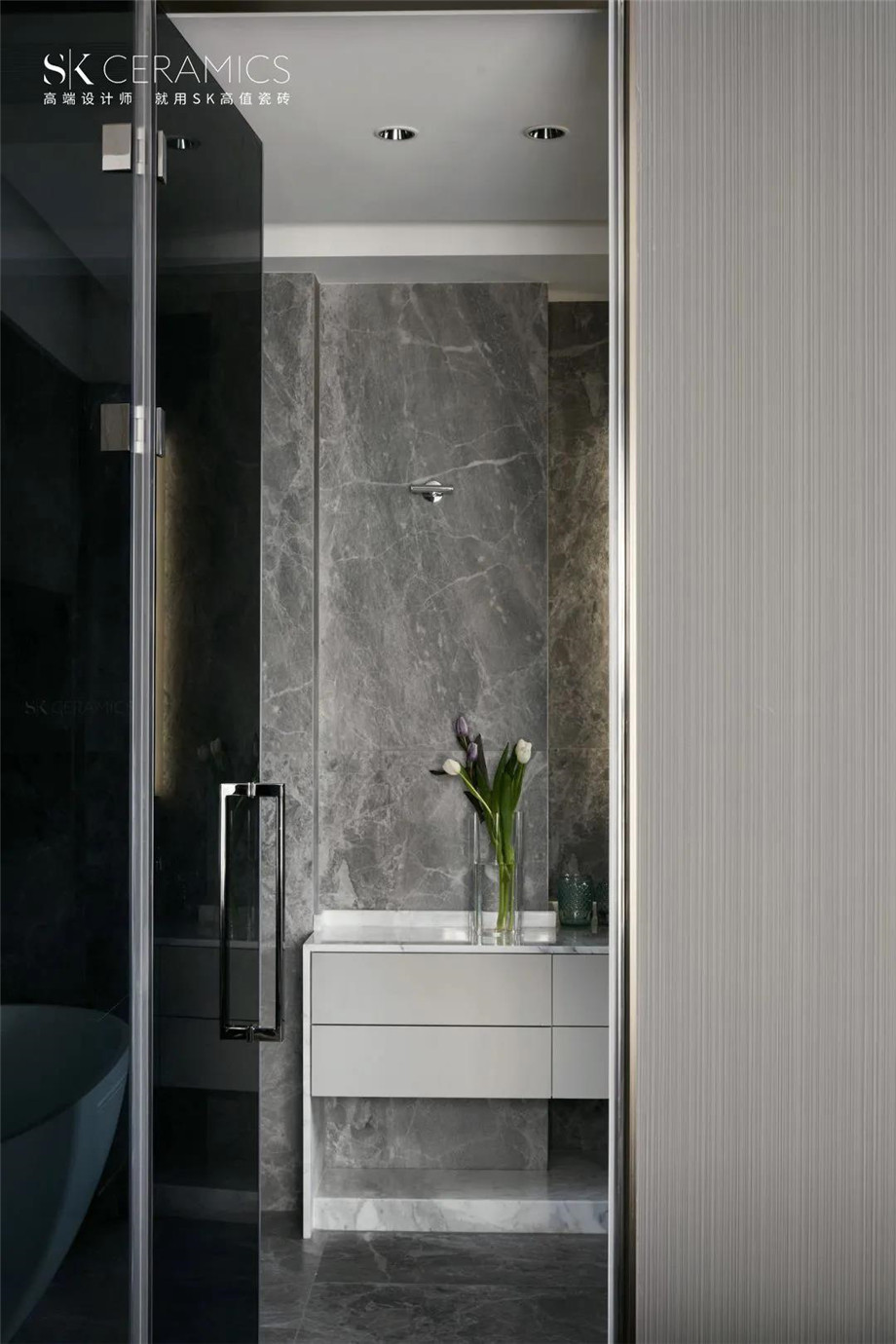 地面以SK 600x1200mm魚肚灰鋪設,紋理自然流暢,柔和張力讓每一絲紋理都顯得自然分明,讓空間彌漫著優雅格調。