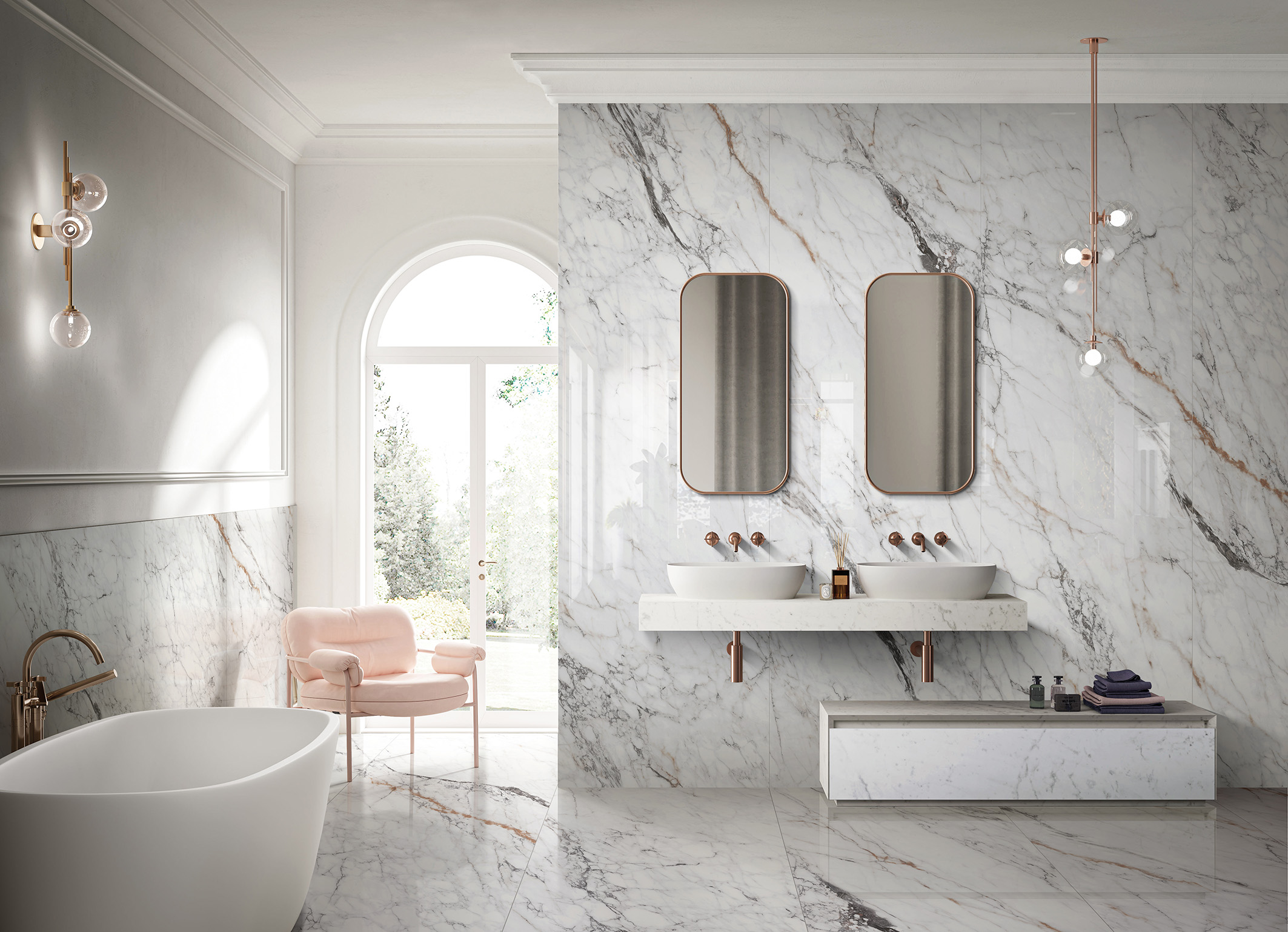 以雪白肌底,粗狂自然的紋理與深淺交替的,金色、黑色相互融嵌色澤豐富,用色沉穩中,帶有透麗的質感,勾勒出天然優雅的高級感。